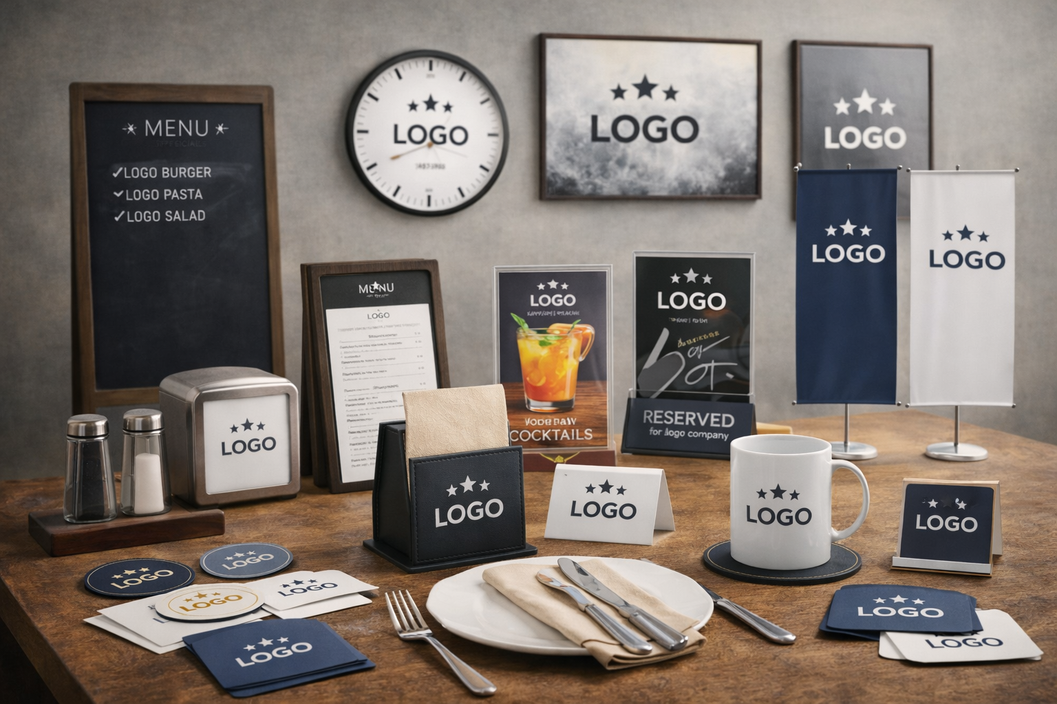 Servilleteros, Portamenú, Expositores, Pizarras, Banderolas, Cuadros, Relojes, Posavasos,etc.