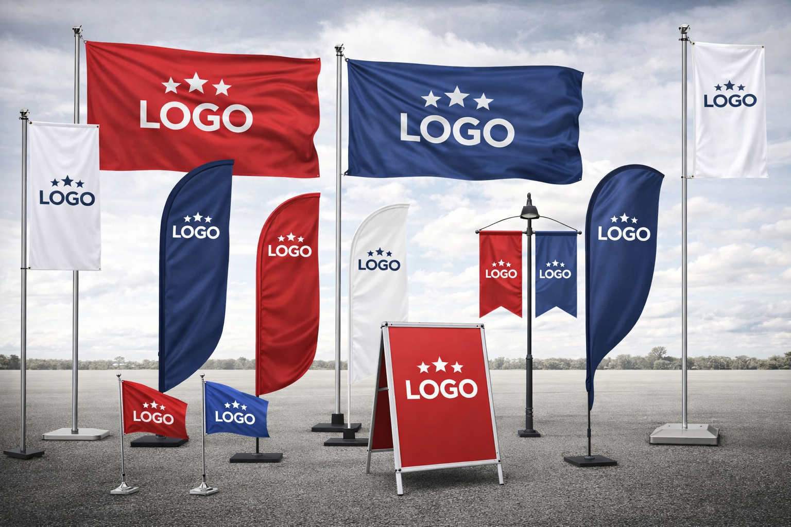 Banderas personalizadas para cualquier tipo de evento. Además de diferentes modalidades de mástiles,etc.
